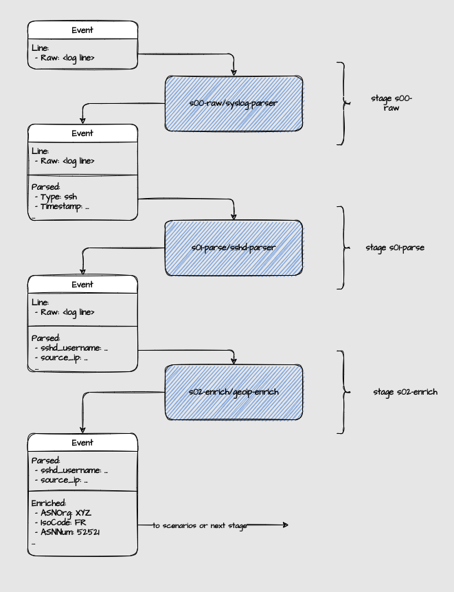 s00-raw: This is the first stage which aims to normalize the logs from various Data Sources into a predictable format fors01-parseands02-enrichto work on.s01-parse: This is the second stage responsible for extracting relevant information from the normalized logs based on the application type to be used bys02-enrichand the Scenarios.s02-enrich: This is the third stage responsible for enriching the extracted information with additional context such as GEOIP, ASN etc.