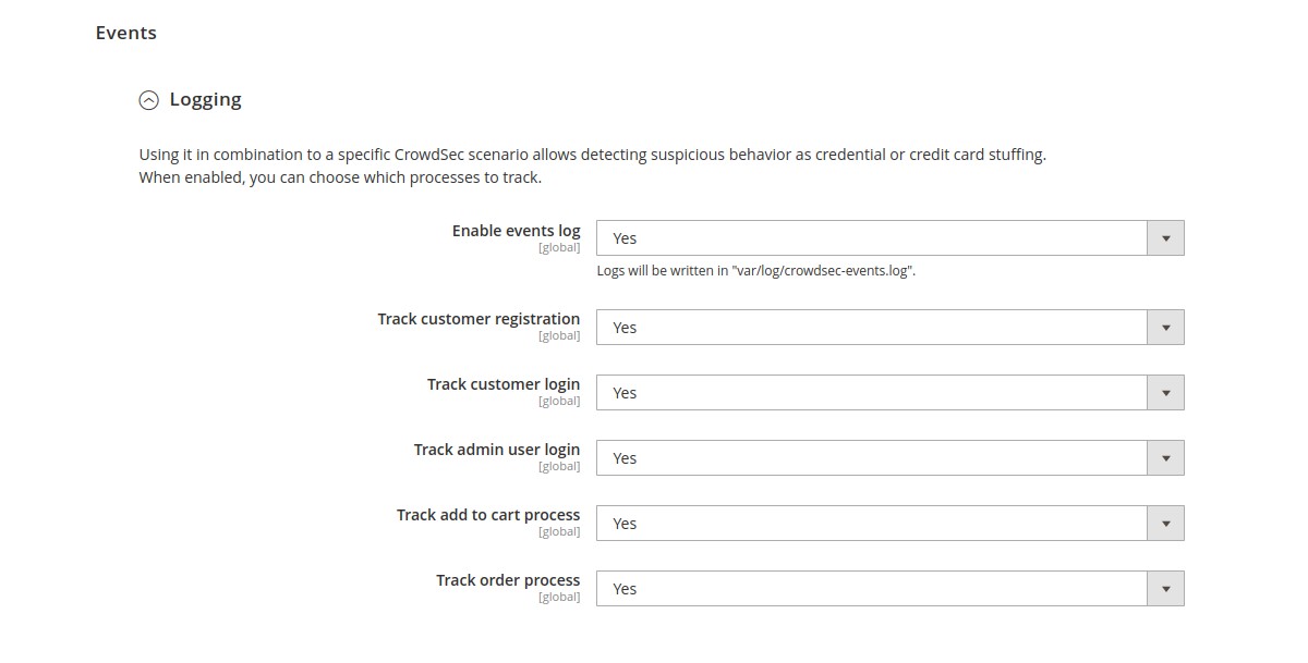 In the Events part, you can enable business events logging. Using it in combination to a specific CrowdSec scenario allows detecting suspicious behavior as credential or credit card stuffing.