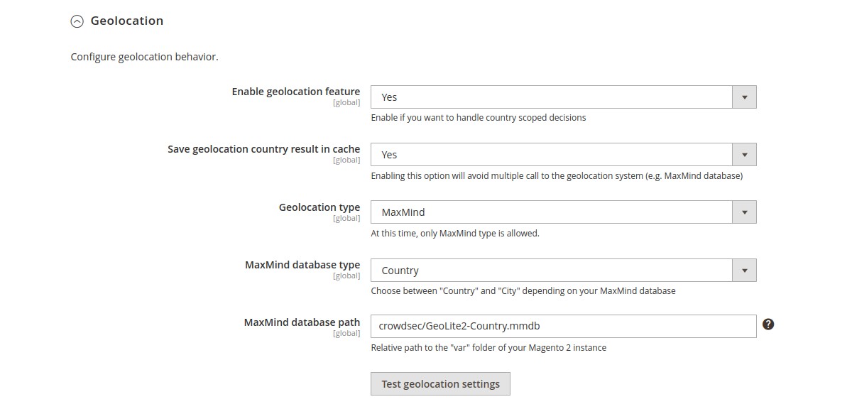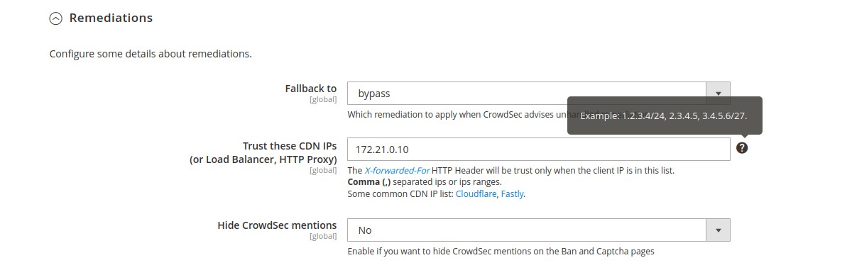 This module comes with configurations that you will find under Stores β†’ Configurations β†’ Security β†’ CrowdSec Bouncer admin section.