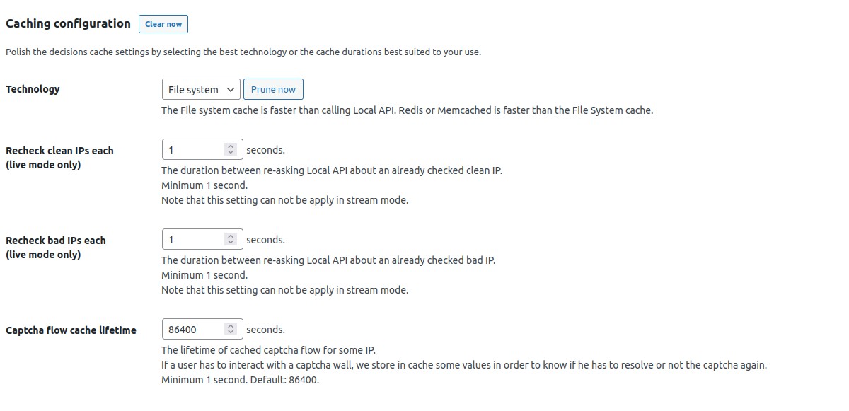 In the Advanced part, you can enable/disable the stream mode, choose your cache system for your CrowdSec Local API, handle your remediation policy, manage geolocation feature, adjust some debug parameters and testing parameters.