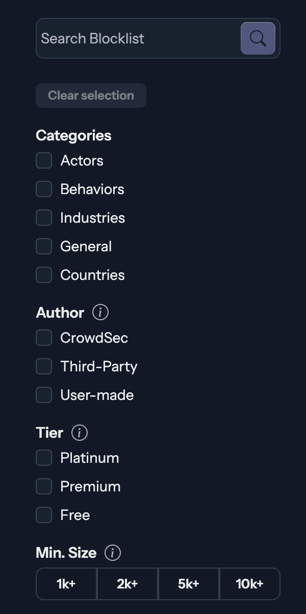 The left-hand panel is dedicated to the search engine, which allows you to efficiently browse and filter blocklists based on specific criteria. Using these filters helps you quickly locate blocklists that match your organization’s specific requirements.