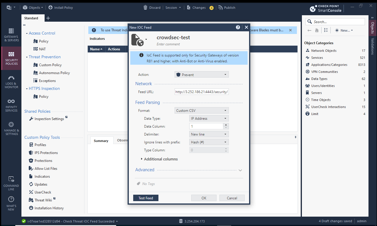 Click on "Custom Policy", then below on "Indicators". Add your feed information and click "Test Feed".